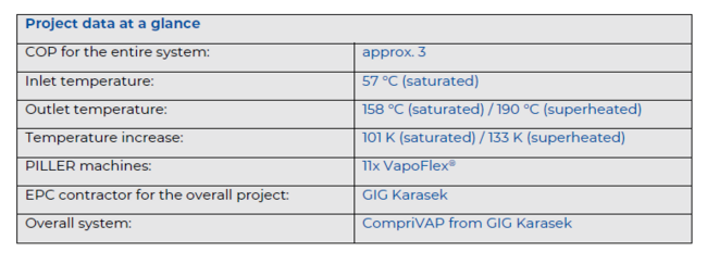 The innovative steam compression system sets new standards in terms of both the efficiency and quality of steam generation. In a first step, waste heat is used in a flash cycle of GIG Karasek to generate flash steam under vacuum conditions. This steam is then compressed to a pressure above atmospheric pressure by six VapoFlex® arranged in series (line 1). A key requirement for the downstream process is to avoid ingress of even minimal quantities of atmospheric oxygen. For design reasons, meeting this strict process requirement is a complex undertaking for the system comprising compressors and connecting pipelines in the vacuum area. A concept with an intermediate heat exchanger in the form of a customized plate falling film evaporator from GIG Karasek was therefore selected. This prevents atmospheric air from entering the downstream process. The newly acquired live steam in the intermediate heat exchanger, which is at above atmospheric conditions, is then compressed to the required pressure and temperature level by five further VapoFlex® units arranged in series (line 2). The result: up to 60 tons of steam per hour.